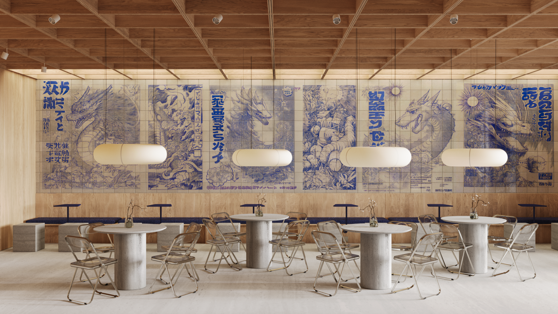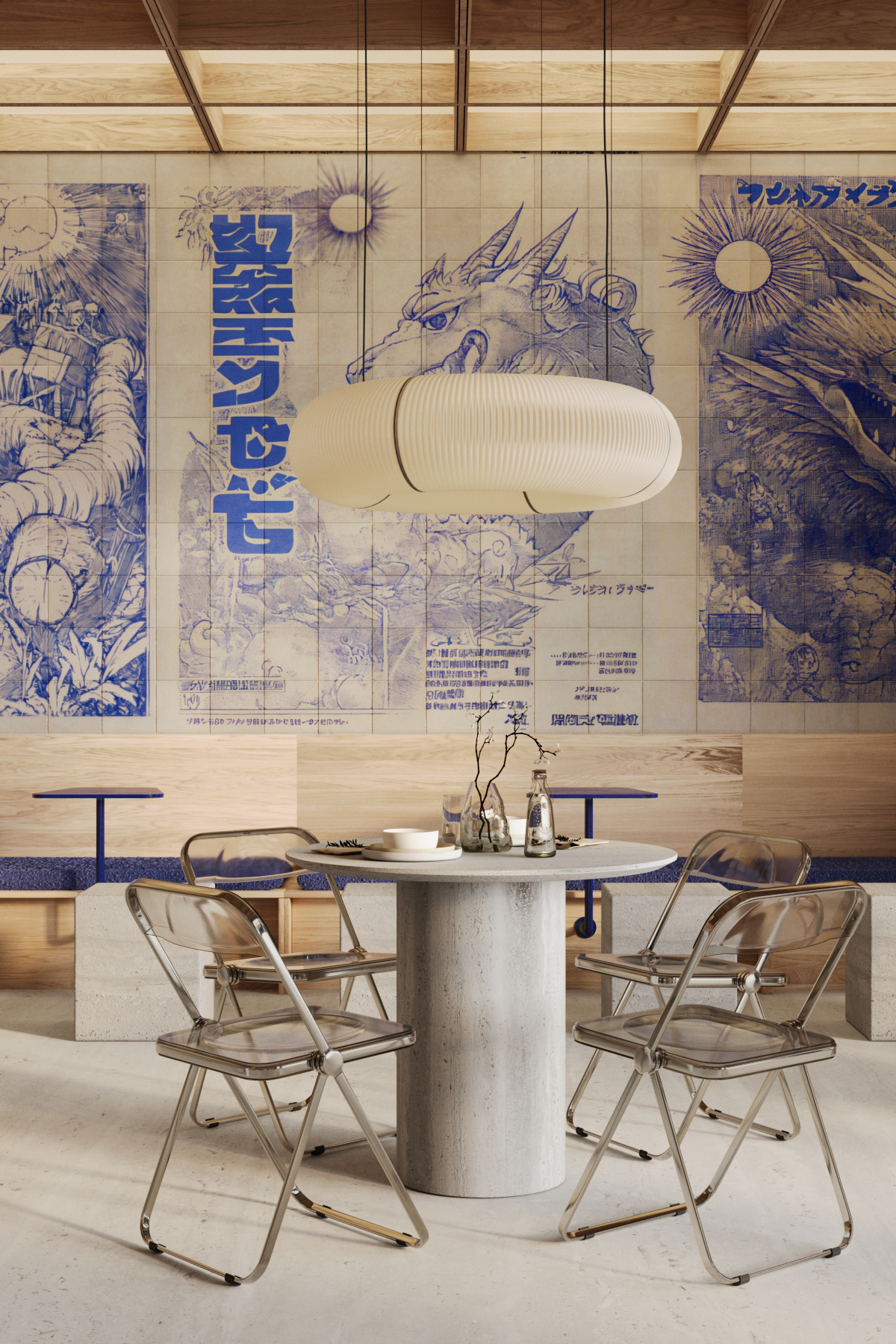 The interior combines wood textures, stainless steel surfaces and graphic ceramic patterns, creating a modern interpretation of Japanese dining spaces.
