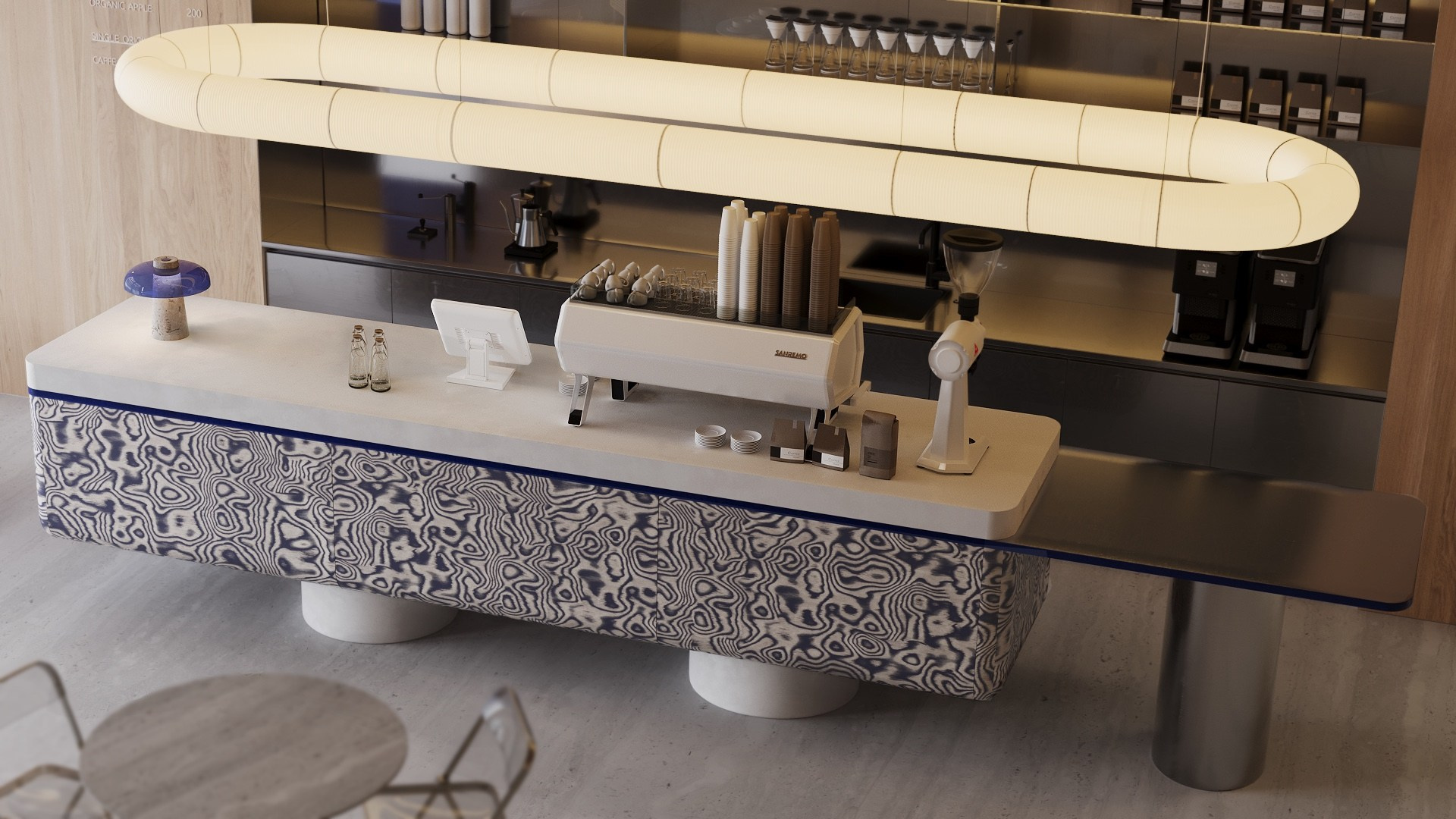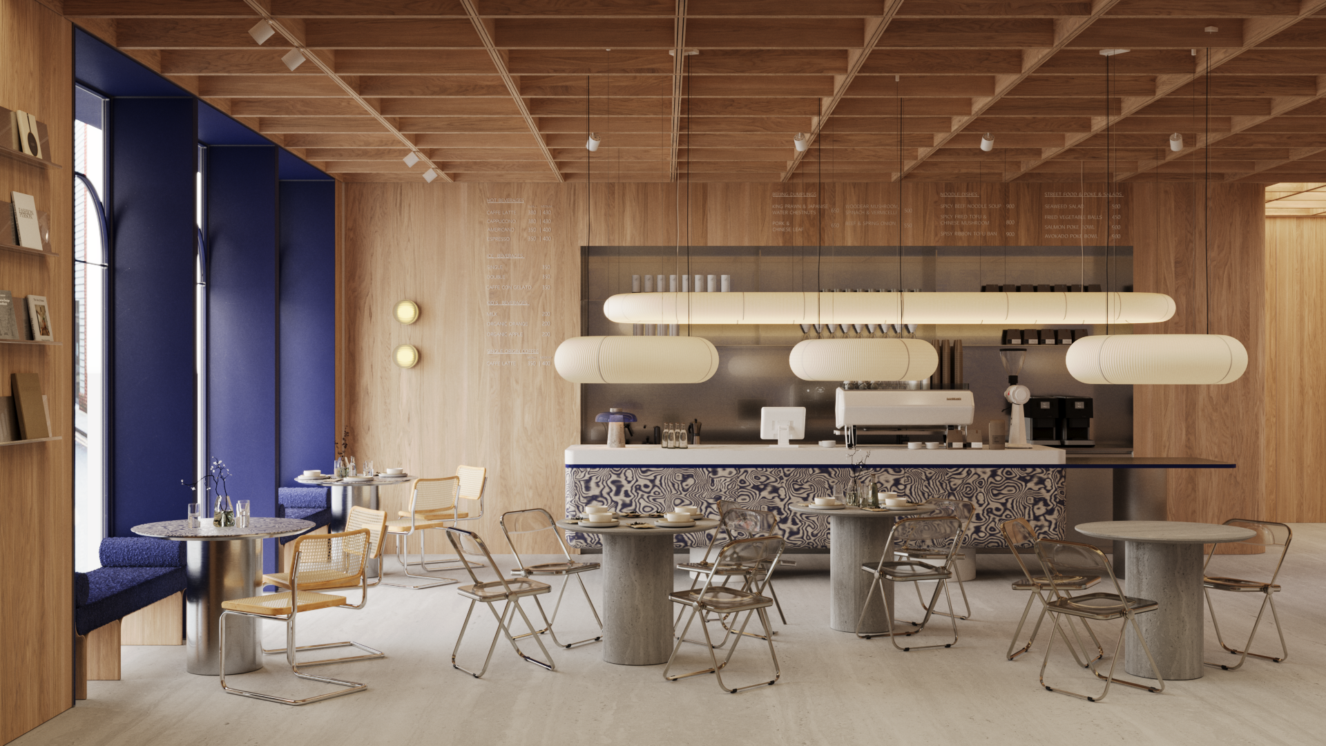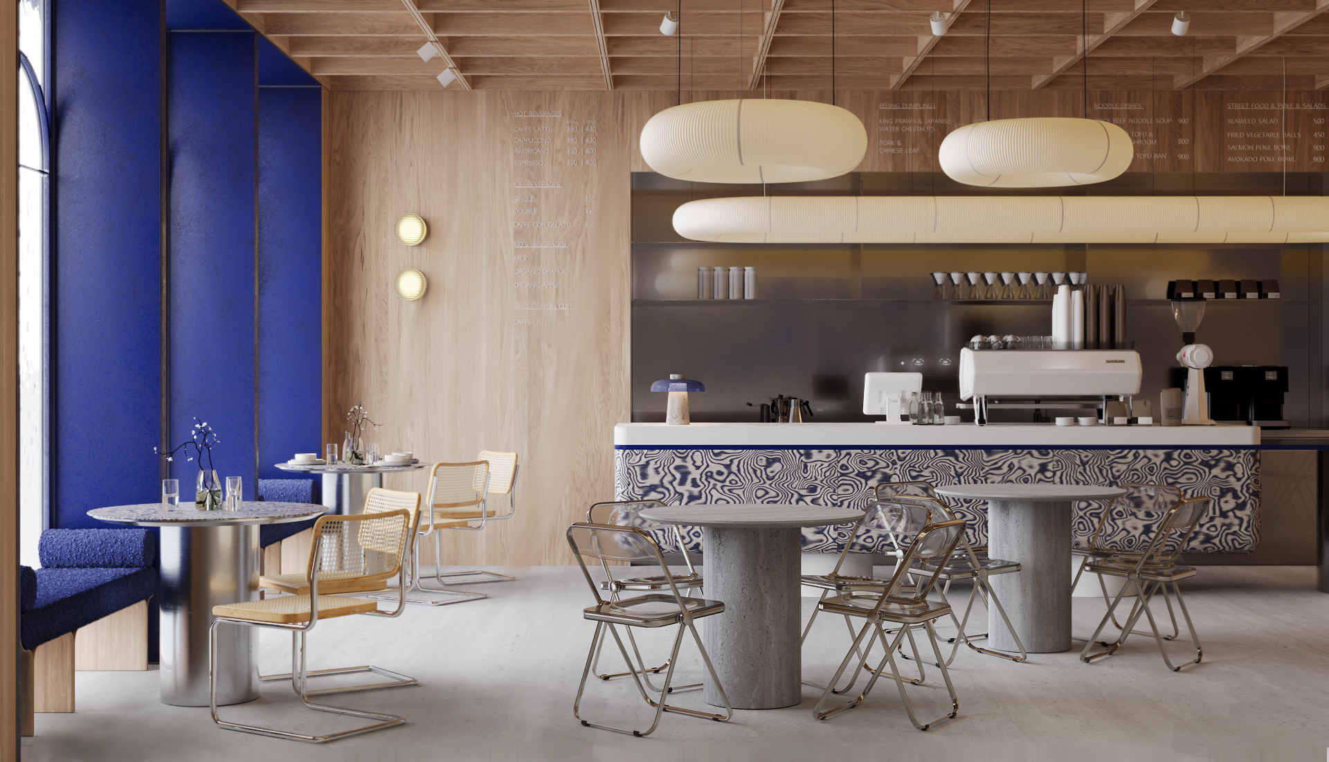 A contemporary Japanese bar and restaurant project exploring the contrast between warm natural materials and deep cobalt blue accents.
